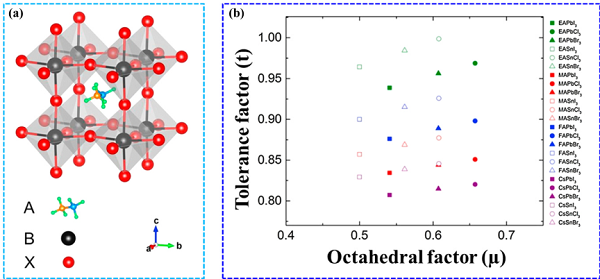 (b)不同的常用有机无机杂化钙钛矿化合物,经计算得到的八面体和容差因子。