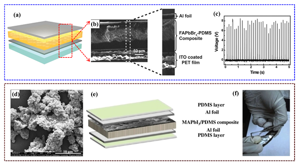 (a,b) 制得的FAPbBr3-PDMS复合物基压电发电机的示意图和SEM横截面图像;