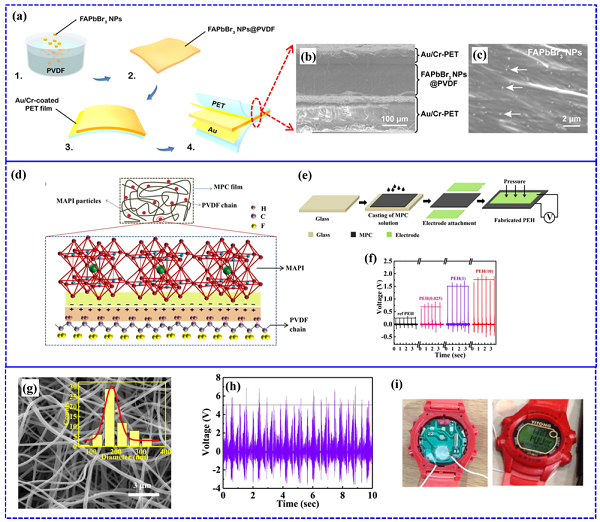 (d)基于形电极(IDE)的MAPbI3压电发电机的示意图和SEM横截面图像;