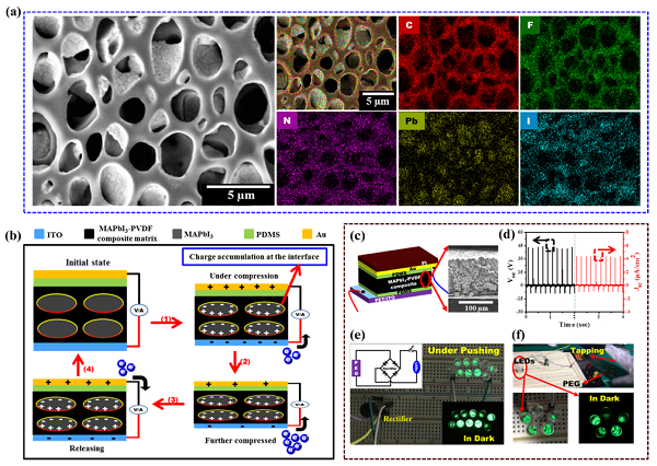(e,f) MAPbI3-PDMS复合物发电机的示意图和实物照片。