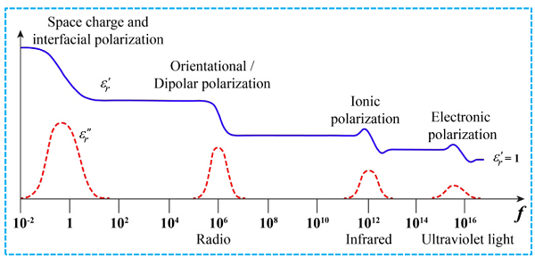 图2:分别在界面/空间电荷极化、取向极化、离子极化和电子极化机制下,介电常数的实部和虚部与频率的依赖关系。