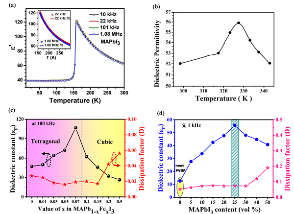 (d)含不同体积分数的MAPbI3的MAPbI3-PVDF复合物薄膜,在1kHz下测得的介电常数和损耗角正切。