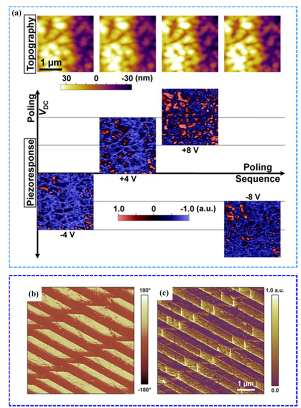 (a)直流极化后,原子力显微镜地形图(上方一行),和对应的表现A·sin(φ)压电响应的压电力显微镜图像,表明β-MAPbI3薄膜中部分可逆铁电畴在不同偏压过程后发生了转换;