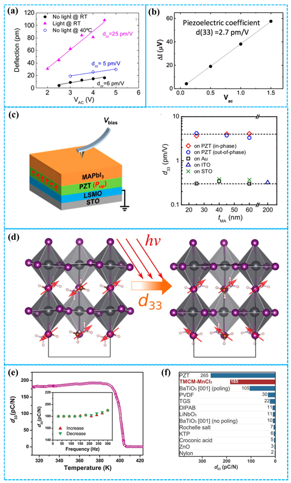 (d)在光照下的MAPbI3的分子排列示意图以及其光照增强的压电性。