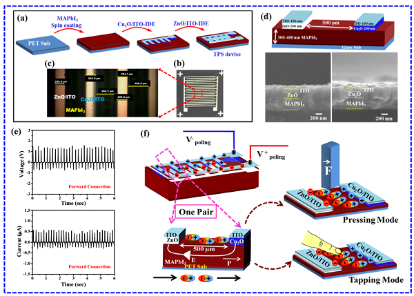 (c)捕捉到的形电极(IDE)基MAPbI3压电发电机光学图像;