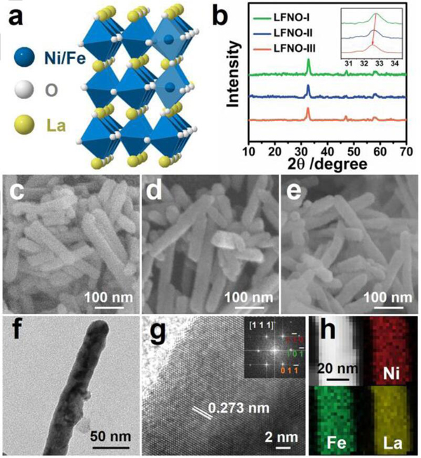 (f-h)分别为LFNO-II NRs的TEM图像(f),HRTEM图像(g)(插图显示FFT模式)和STEM-EDS(h)元素分布图。
