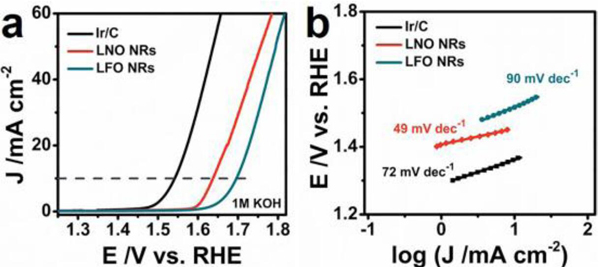 (b)LFO NRs,LNO NRs和商业Ir/C的OER的Tafel图。