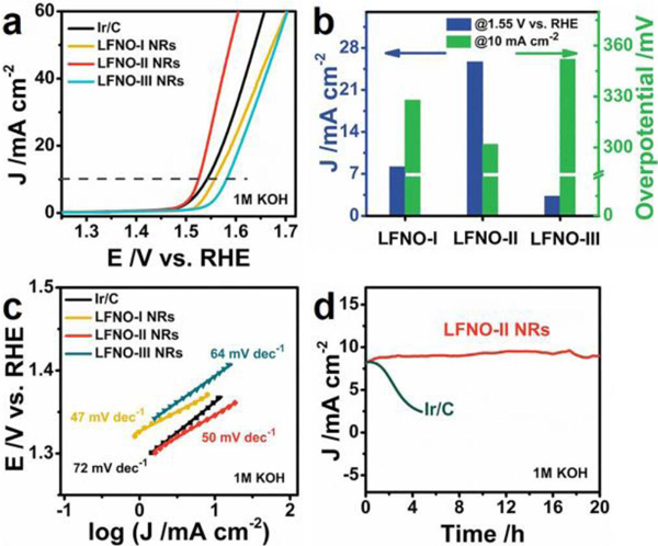 (a)各种LFNO NRs和商业Ir/C的OER的LSV曲线。
