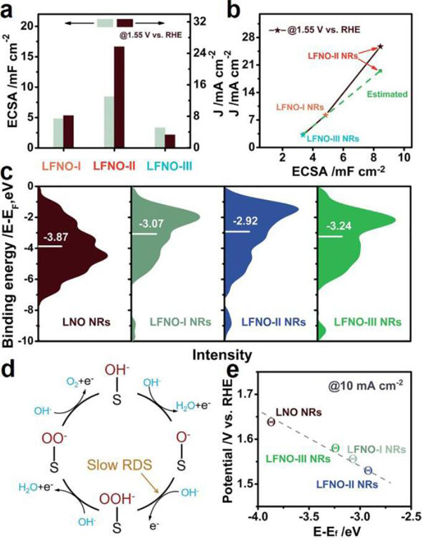 (e)LNO,LFNO-I,LFNO-II和LFNO-III NRs在10mA cm-2下的OER活性与E-Ef参数的函数关系。