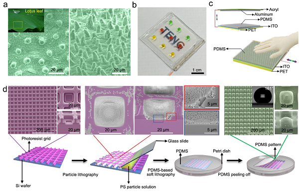 d)具有3D分级微纳结构超疏水表面PDMS 摩擦层材料的自清洁功能;