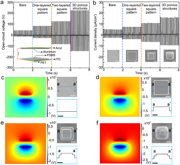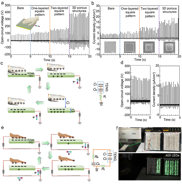 a)与 b)用戴有天然橡胶手套的手拍打具有不同表面形貌PDMS 摩擦层材料的单电极TENG 的开路电压与短路电流对比;