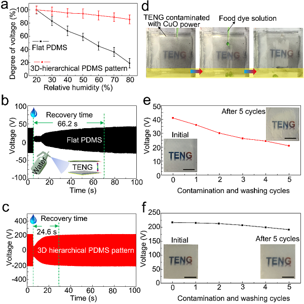 a)具有平坦表面以及3D分级微纳结构超疏水表面PDMS 摩擦层材料的纳米发电机输出电压随环境湿度的变化情况;