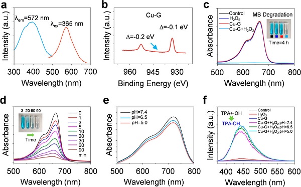 (c)pH = 7.4时,MB降解显示由Cu(I)和H2O2之间的类Fenton反应可以产生·OH;
