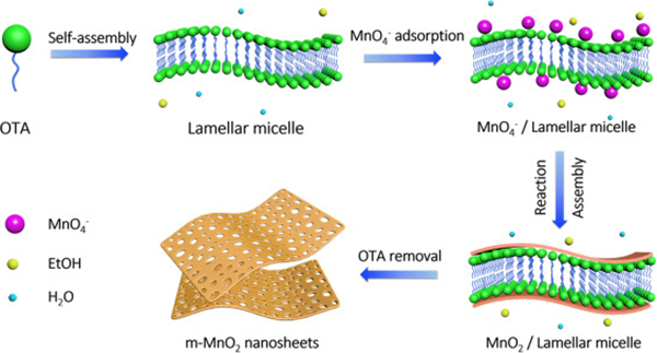 便携式电子器件的快速发展极大地刺激了现代社会对多功能化、微型化的电化学储能器件的需求。其中,平面微型超级电容器(MSCs)作为最具竞争力的微型储能器件之一,具有功率密度高,使用寿命长,质量轻,尺寸大小可定制,灵活性高和安全性能好等优点。众所周知,MSCs的比能量与电极材料的比容量和器件工作电压的平方成正比,因此,发展高容量电极材料和拓宽器件的工作电压是提高MSCs比能量的有效方法。近来,二维材料,如石墨烯、MXene、phosphorene、VS2和MoS2等,被广泛应用于平面微型超级电容器,并显示出许多独特的优势:(1)电解液离子能沿着二维纳米片平面方向无障碍的快速迁移,(2)能充分利用二维纳米片厚度和平面形态的优势,二者有效协同提高微型储能器件的电化学性能。其中,MnO2纳米片由于超薄的二维结构,大的比表面积,高的理论比容量 (1370 F g-1),多种氧化价态和环境友好等特点,已被广泛应用于超级电容器的电极材料。但是,MnO2纳米片在充放电过程中的体积膨胀会引起容量的快速衰减。一种有效的解决方法是制备具有平面介孔结构的MnO2纳米片。介孔MnO2纳米片不仅可以缓冲体积膨胀,提高电极的稳定性,而且还能促进离子扩散,提升倍率性能。另外,MnO2是一种非常有前景的水系非对称超级电容器的正极材料。它与一些负极材料(如石墨烯、碳管)匹配后,能够有效拓展水系非对称超级电容器的工作电压(2.0 V或更高)。然而,介孔超薄的MnO2纳米片的可控合成,以及在高性能非对称微型平面超级电容器(AMSCs)中的研究仍存在很大挑战。