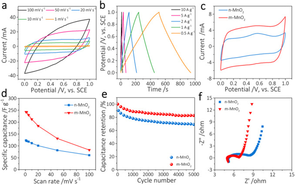 图 3 m-MnO2纳米片和无孔MnO2(n-MnO2)纳米片的电化学性能对比图