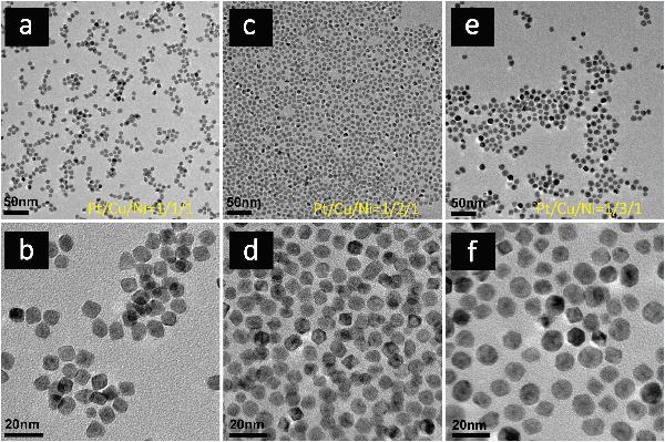 e,f) Pt/Cu/Ni比为1/3/1的PtCuxNi-r NCs (131-PtCuNi-r) TEM图像。