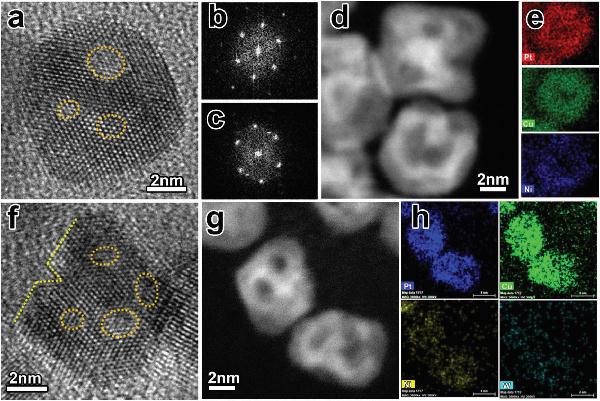 a,f) 131-PtCuNi-t和131-PtCuNi-W NCs的高分辨率TEM图像;