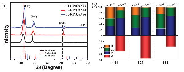 a) 合成的111-、121-和131-PtCuNi NC的XRD图谱;