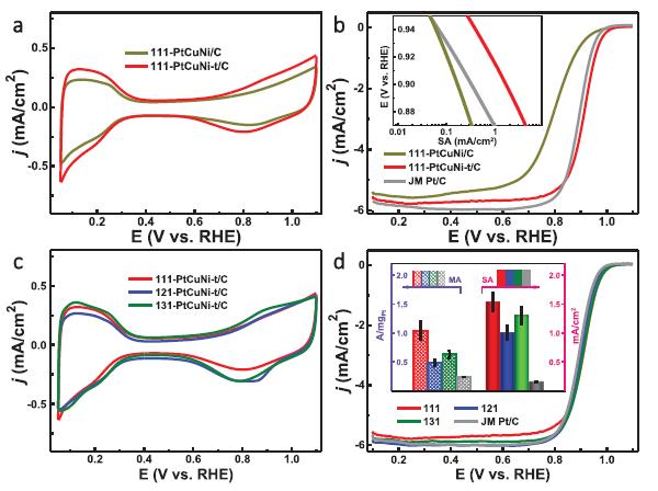 c,d) 酸处理后的111-PtCuNi-t/C(红色)、121-PtCuNi-t/C(蓝色)和131-PtCuNi-t/C(橄榄色)催化剂的CV和LSV。