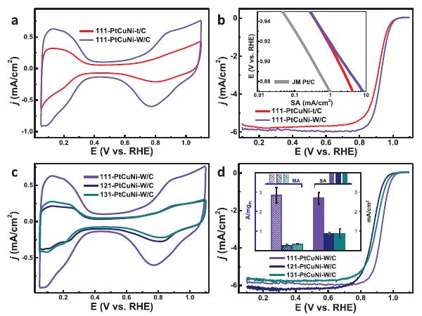 a,b) 酸处理前(深黄色)后(红色)的111-PtCuNi/C催化剂的CV和LSV曲线,b图内插为相应LSV曲线的Tafel图;