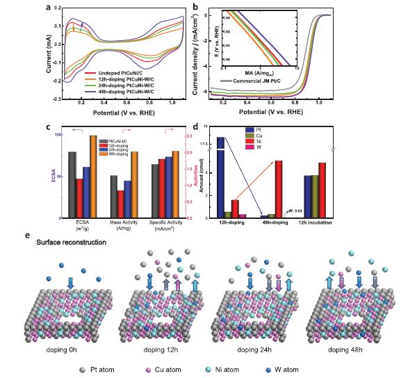 a,b) 掺杂12、24和48 h后111-PtCuNi-W/C的LSV和CV曲线;