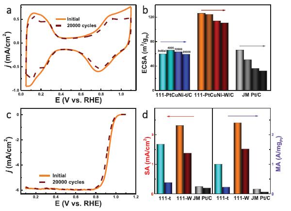a) 111-PtCuNi-W/C的初始和第20000次循环CV曲线;