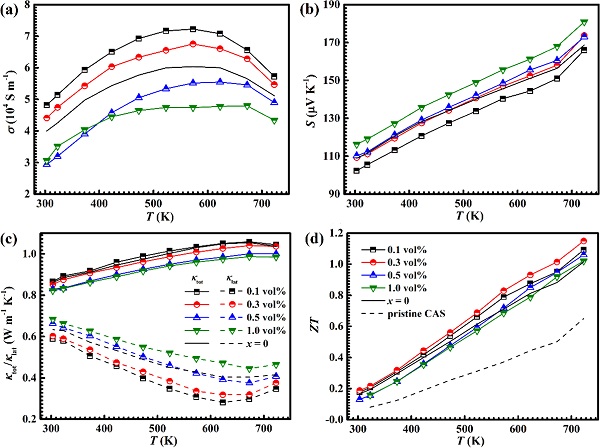 d) CNAS-xNPs复合材料的ZT值随温度的变化。