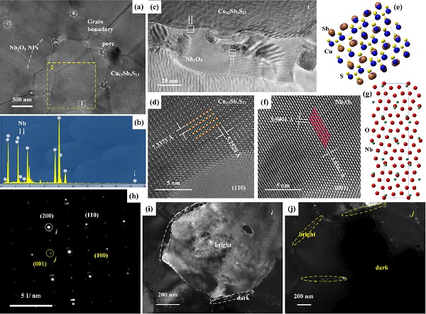 近日,清华大学李敬锋教授(通讯作者)等采用机械合金化(MA)和放电等离子烧结(SPS)相结合的简便方法合成了Nb2O5纳米颗粒分散的Cu11.5Ni0.5Sb4S13-δ复合材料,并在Nano Energy上发表了题为“Enhanced performance of thermoelectric nanocomposites based on Cu12Sb4S13 tetrahedrite”的研究论文。通过重复的MA和SPS工艺得到的细粒纳米结构提高了整个温度范围内的电导率和功率因数。由于强烈的低中频声子散射,均匀分布的Nb2O5纳米颗粒和纳米孔将晶格热导率有效降低至0.6 W·m-1·K-1。少量的Nb2O5添加(0.3 vol %)使得723K时ZT值高达1.2,与基底样品相比增加~50%。上述纳米复合材料还具有高平均ZT值、热电转换效率和断裂韧性。