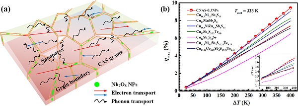 b) CNAS-0.3NPs样品和先前报道的四面体化合物的最大转换效率(ηmax)随温差(ΔT)变化的比较,内插为平均ZT值(ZTave)与ΔT之间的关系。 对于ηmax和ZTave,假设所有材料的冷侧温度(Tcold)为323K。