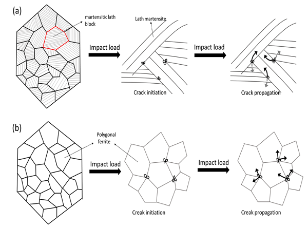 要点:多边形铁素体和超低碳板条铁素体的裂纹形成能相当,主要差别在于裂纹扩展所需的能量不同。多边形铁素体没有稳定裂纹扩展阶段,裂纹形成后直接失稳扩展。而超低碳板条马氏体在裂纹形成后有稳定扩展阶段,消耗大量冲击功,使冲击韧性明显提高。