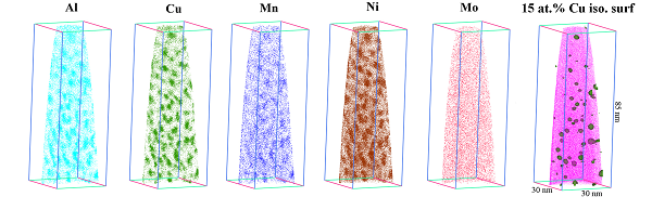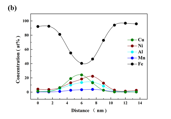 要点:在超高强度低碳钢中,纳米级沉淀相富含Cu、Ni、Al和Mn元素,且时效峰状态下形成了以Cu元素为核,Ni(Al, Mn)相偏聚于界面的核壳结构沉淀相。纳米沉淀相在时效过程中表现出尺寸逐渐增加,数量密度逐渐减少的演变规律。
