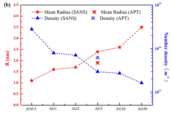 图5 超高强度低碳钢中纳米相不同时效阶段(a)小角中子散射表征结果及(b)尺寸和数量密度演变规律图