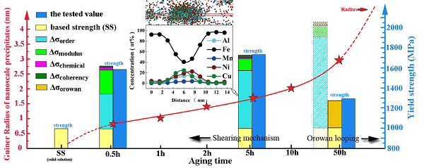 要点:从固溶态到时效峰状态下,伴随着纳米相尺寸的增加,纳米相强化效果增强,在此阶段中,纳米相主要通过切过机制贡献强度。而在切过机制中,有序强化和模量强化占主要部分;在过时效过程中,纳米相强化机制由切过机制转变为Orowan绕过机制,强化效果减弱。