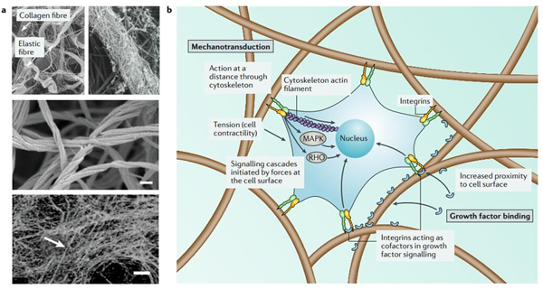 (b)原纤维结构对力学传导和生长因子信号传导的影响。
