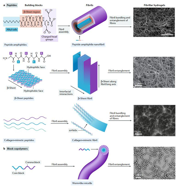 纤维水凝胶是组织工程、再生医学和3D细胞培养的优秀支架,可以制成类似体内ECM的机械性质和改善的质量传递。纤维状水凝胶可以用生长因子和细胞粘附配体功能化。纤维状水凝胶的各种构建块:包括肽、嵌段共聚物和丝状纳米颗粒,实现多种应用。