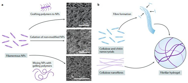 (a)丝状胶体纳米颗粒(NP)凝胶化的三种方法:上图,将胶凝聚合物接枝到NP表面,SEM显示由接枝有聚的纤维素纳米晶体形成的水凝胶;中图,未经修饰的NPs直接凝胶化,SEM图像显示在50 mM Sr2+离子溶液中,纤维素纳米晶体凝胶化水凝胶;下图,纤维素纳米晶体与胶凝聚合物的混合,SEM图像显示纤维素纳米晶体-明胶水凝胶;