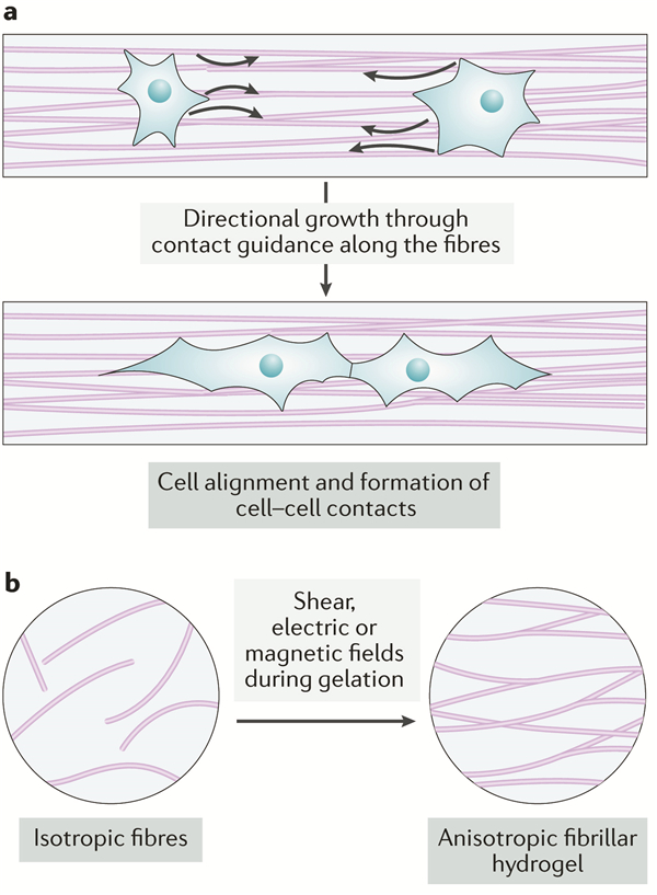 (a)各向异性原纤维基质内接触影响细胞生长,导致细胞排列并促进细胞-细胞接触的形成;
