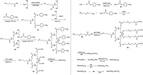 图二、PEG-PTX4、PSN-PEG-PTX4、PEG-SS-PTX4和PSN-PEG-SS-PTX4的合成路线
