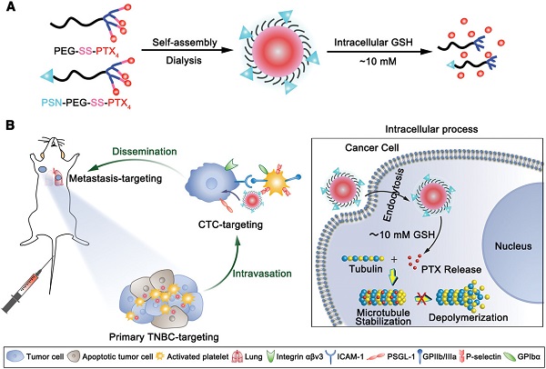 最近,复旦大学的蒋晨教授(通讯作者)等人报道了在负载紫杉醇的氧化还原响应型胶束上修饰P-选择素(在激活的血小板表面上表达)靶向肽 (PSN) 形成的PSN-PEG-SS-PTX4胶束可以利用激活的血小板作为“桥梁”与癌细胞相互作用。PSN修饰的胶束可以通过结合P-选择素容易地粘附到激活的血小板表面,利用血小板对肿瘤转移过程的追踪作用,不仅可以在血液循环中捕获CTCs,还可追踪至转移灶或归巢到原发灶。与Taxol(紫杉醇注射剂,以聚氧乙烯蓖麻油和乙醇为溶剂)和未修饰的PEG-SS-PTX4胶束相比,PSN-PEG-SS-PTX4胶束与肿瘤浸润性血小板的结合明显增多,对原发性TNBC及其转移的靶向性和穿透性显著增强,并因此显著改善了治疗效果。更重要的是,PSN-PEG-SS-PTX4胶束可以有效地抑制TNBC的肺转移,降低肝转移的发生率。靶向激活血小板的氧化还原响应胶束系统为转移性癌症的全方位治疗提供了广阔的应用前景。研究成果以题为“Activated Platelets-Targeting Micelles with Controlled Drug Release for Effective Treatment of Primary and Metastatic Triple Negative Breast Cancer”发布在国际著名期刊Adv. Funct. Mater.上。