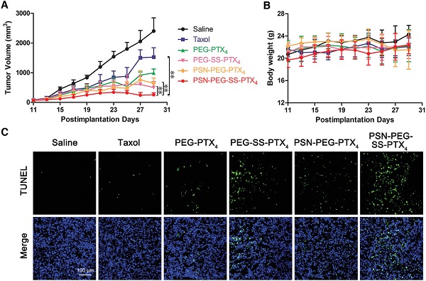 (A) 注射BODIPY标记PEG-SS-PTX4胶束和PSN-PEG-SS-PTX4胶束0.5 h后,TNBC原发肿瘤模型小鼠的肿瘤组织冷冻切片的代表性免疫染色荧光图;