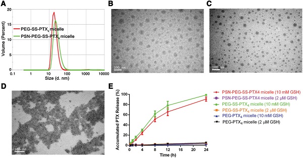 (D) 用含10×10-3 M GSH 的PBS(pH = 7.4)处理4 h后PSN-PEG-SS-PTX4胶束解离的TEM图;