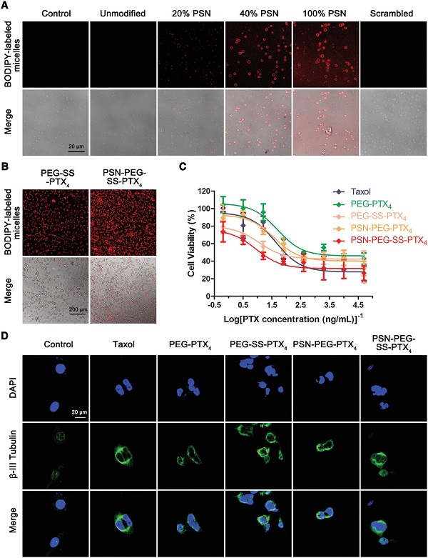 (B) 与激活的血小板预孵育0.5 h后,BODIPY标记的PEG-SS-PTX4胶束和PSN-PEG-SS-PTX4胶束(40%PSN修饰)的细胞摄取;