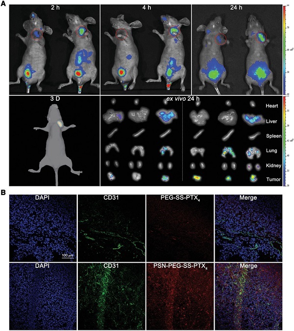 (B) PSN-PEG-SS-PTX4胶束的作用示意图。