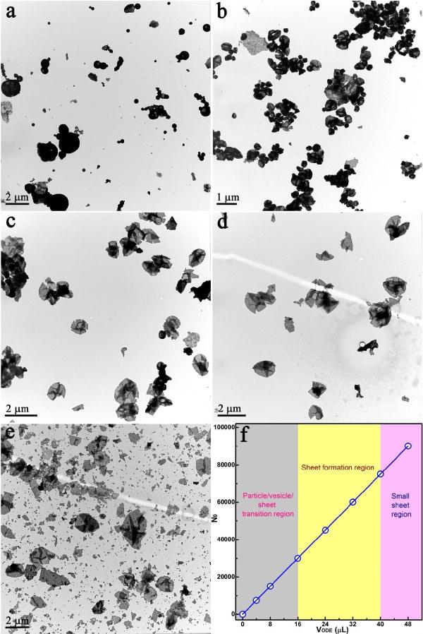a-e) 由不同量(0/4/8/24/48 μL)的ODE诱导NP组装样品的TEM图像;