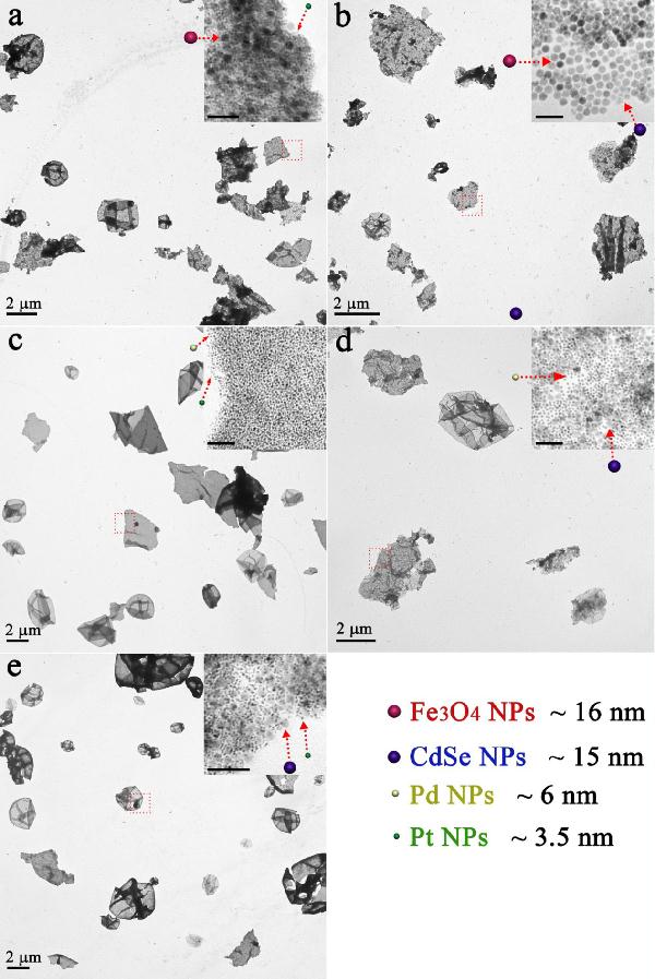 a) 2D Fe3O4-Pt QNS的TEM图像,其中内插标尺为50 nm(下同);