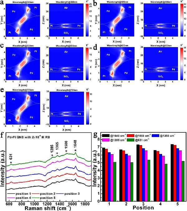 e) 玻璃基底上的Pd-Pt QNS在波长为785nm的入射光的近场电场分布;