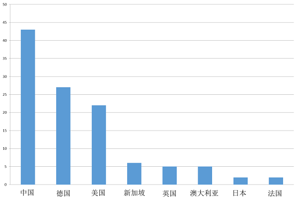在国家分布的统计中,中国参与43篇,美国27篇,德国22篇,新加坡6篇居前四名,英国和澳大利亚以5篇并列第五,日本和法国2篇居第七。从这个数据不难看出,中国、美国和德国远远领先于其他国家,在Angew的高被引文章方面居领跑水平。