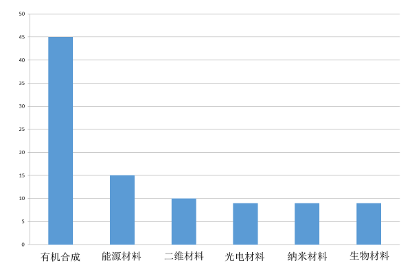 在研究领域的统计中,进入前三的领域分别为:有机合成、能源材料、二维材料,光电材料、纳米材料和生物材料。