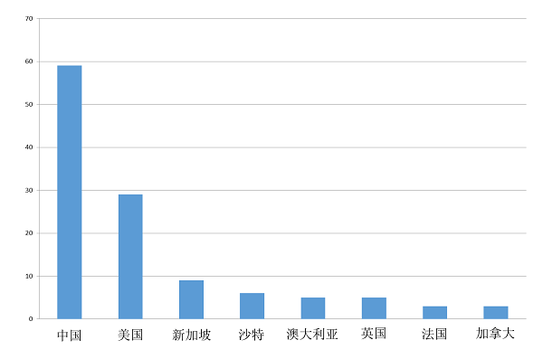 在国家分布的统计中,中国以59篇,美国以29篇,新加坡以9篇位列前三,沙特阿拉伯以6篇位居第四,澳大利亚和英国以五篇并列第五,加拿大和法国以3篇位列第七。从这个数据不难看出,中国远远领先于其他国家,在AM的高被引文章方面属于十分领先的水平。