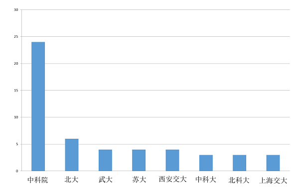 在国内机构分布的统计中,中国院以11篇傲居国内研究机构的第一阶梯,其后是清华的4篇和上海交通大学的3篇,其后的高校各2篇,差距并不明显。